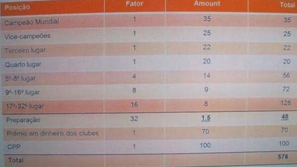70 миллионов будут разделены между клубами, игроки которых поучаствуют на ЧМ-2014. Общий призовой фонд составляет 576 миллионов долларов.